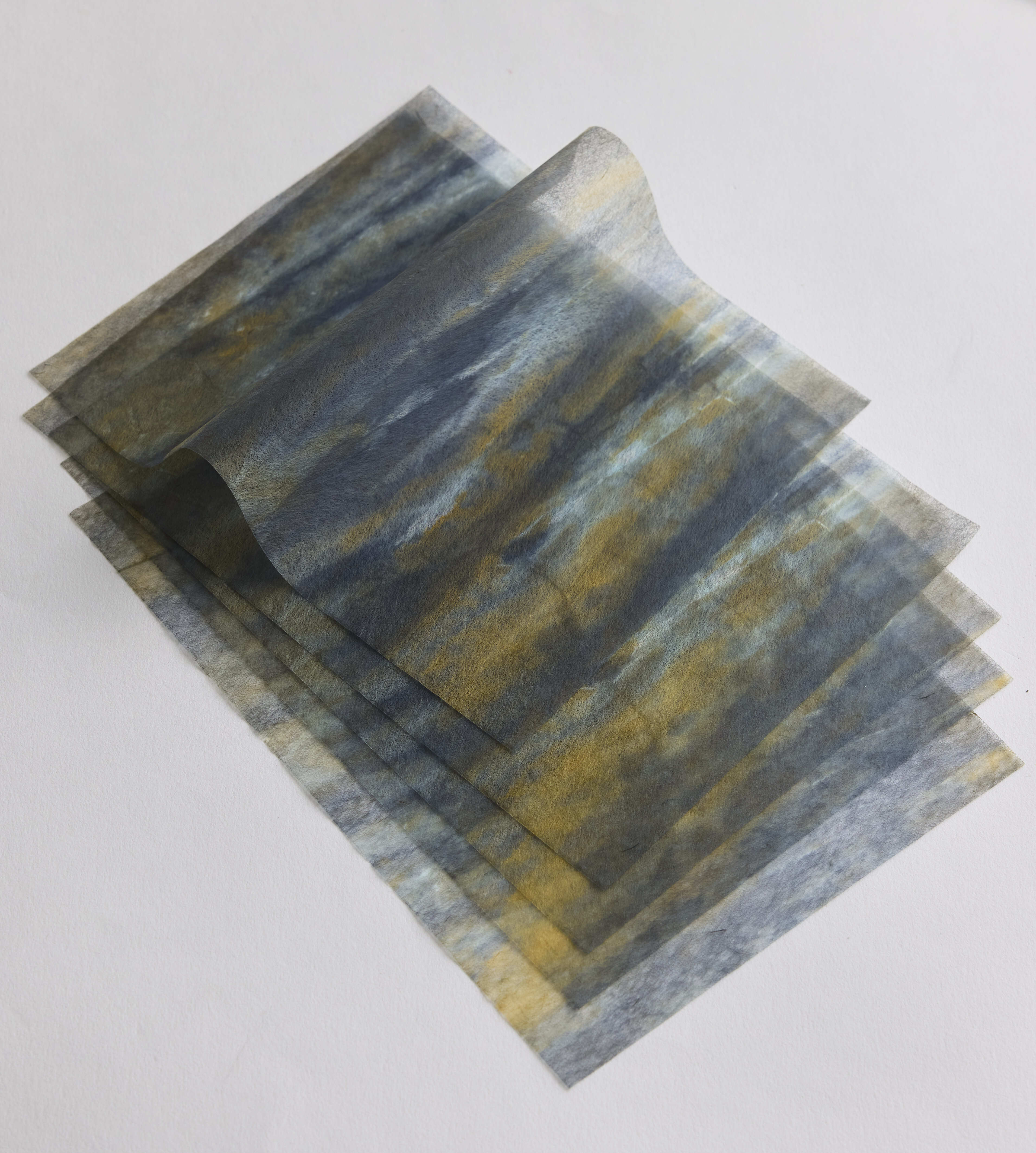 柳絞り染めは、和紙にシワを寄せて束ねた状態で染料を注ぎ込む染色技法です。染料の流れや重なりには計画性がありながら、広げたときに生まれるにじみの表情はひとつひとつ異なります。まるでモネの絵画のような、柔らかな印象が特徴です。