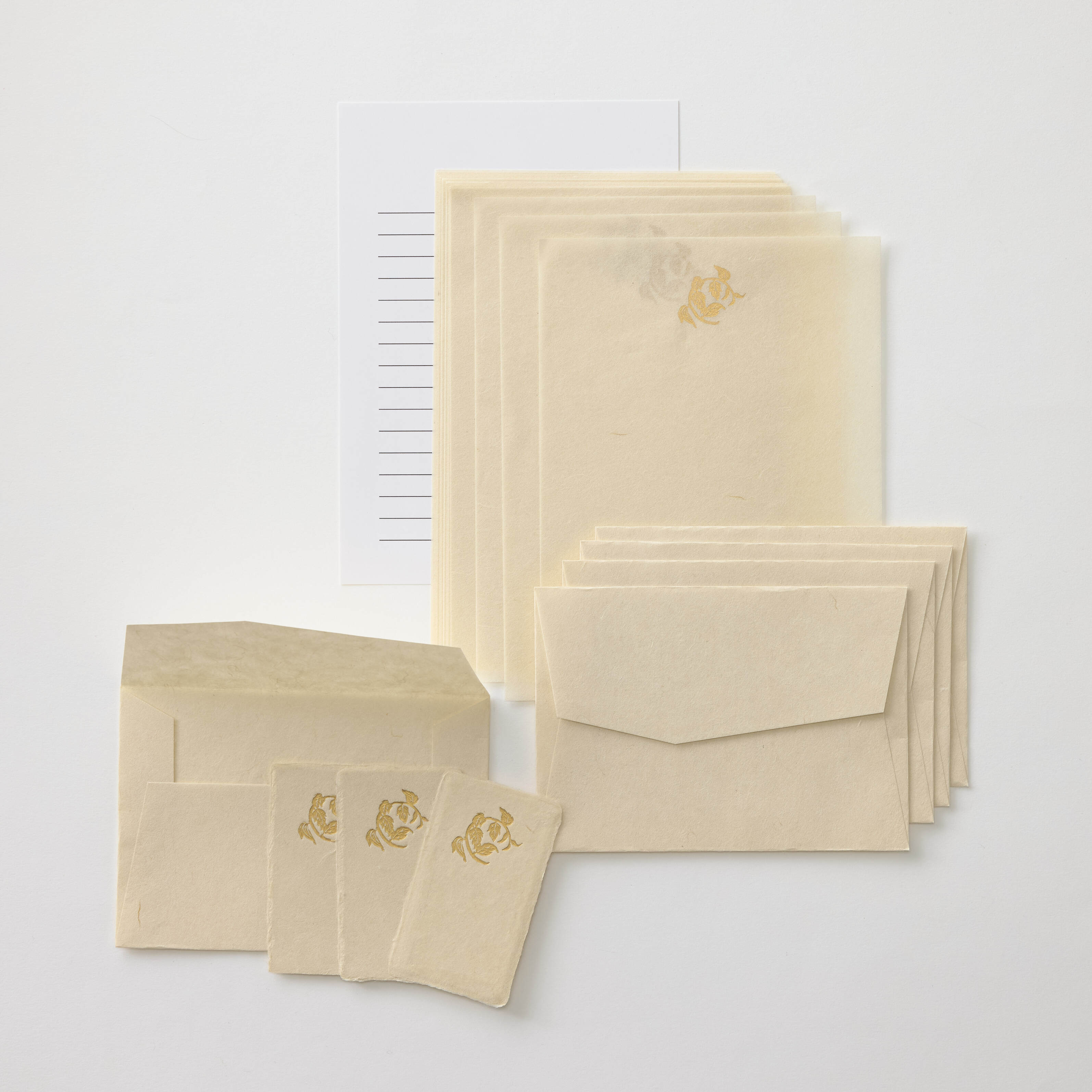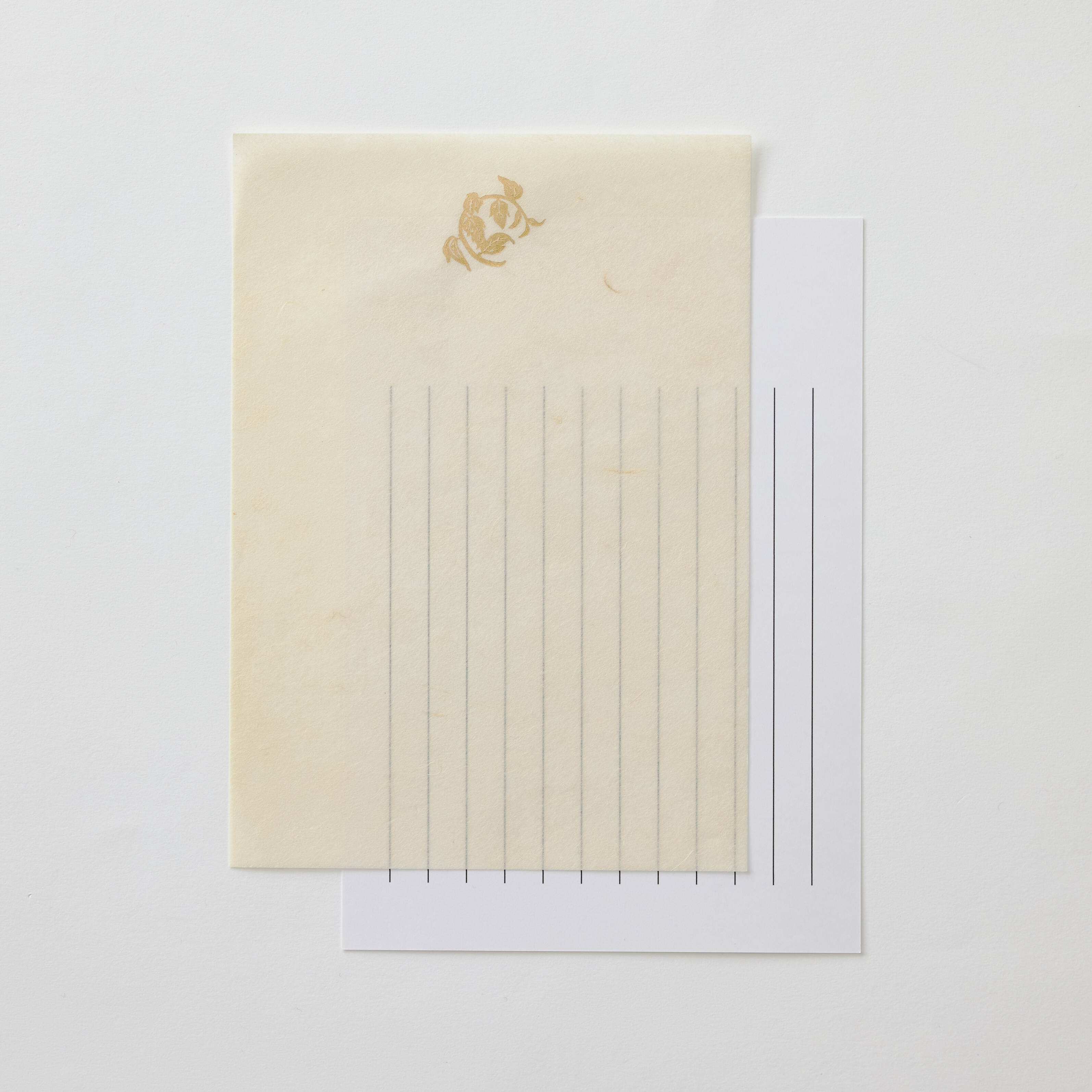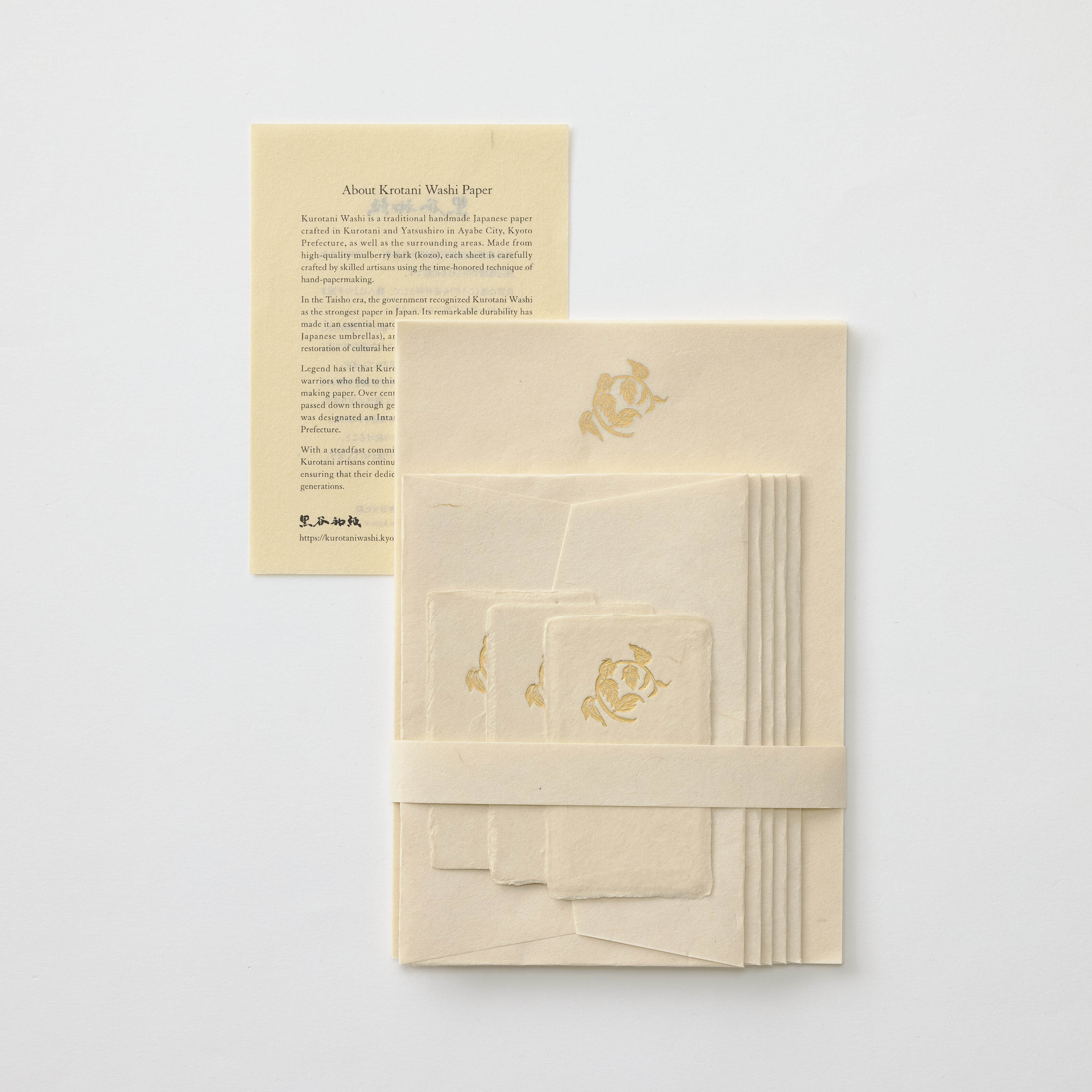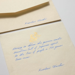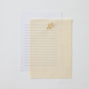 黒谷で手漉きされた和紙に、染色家・金山ちづ子さんが書籍の中で描かれた楮の「紙木印(かみきじるし)」を箔押ししたレターセットです。