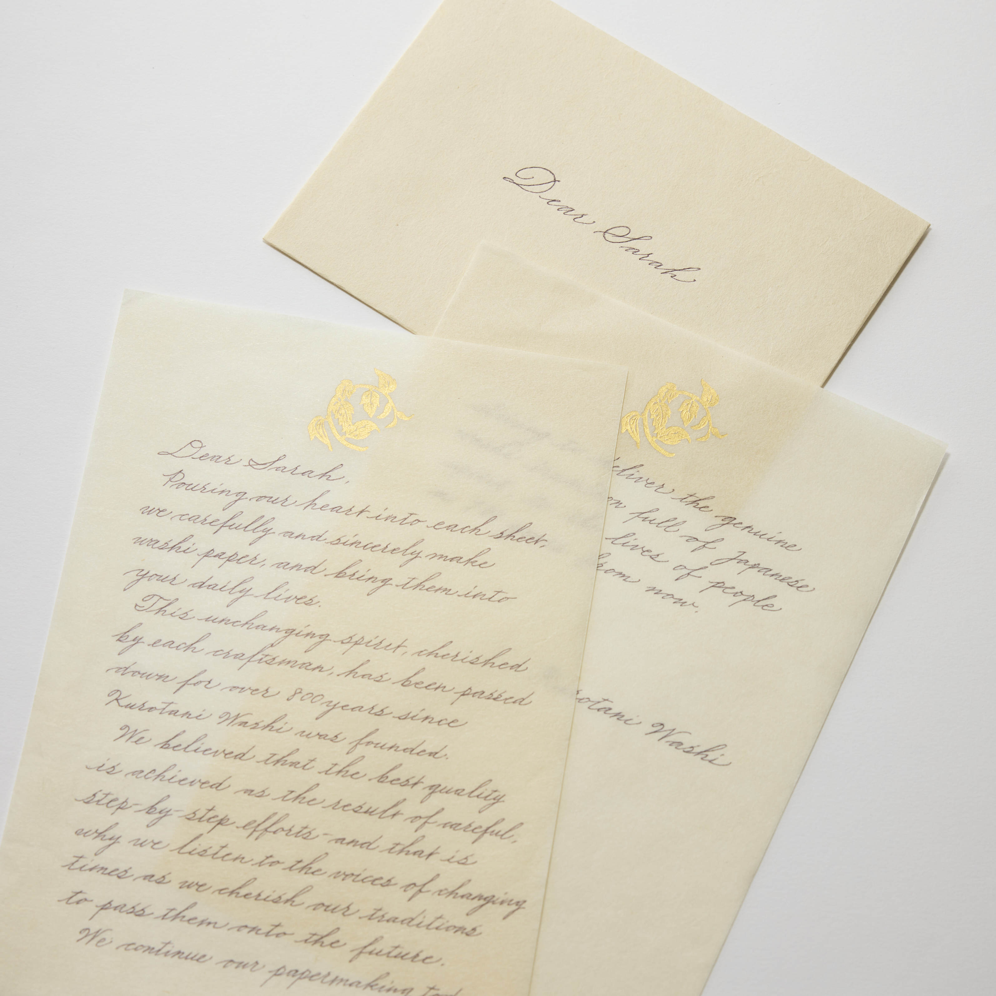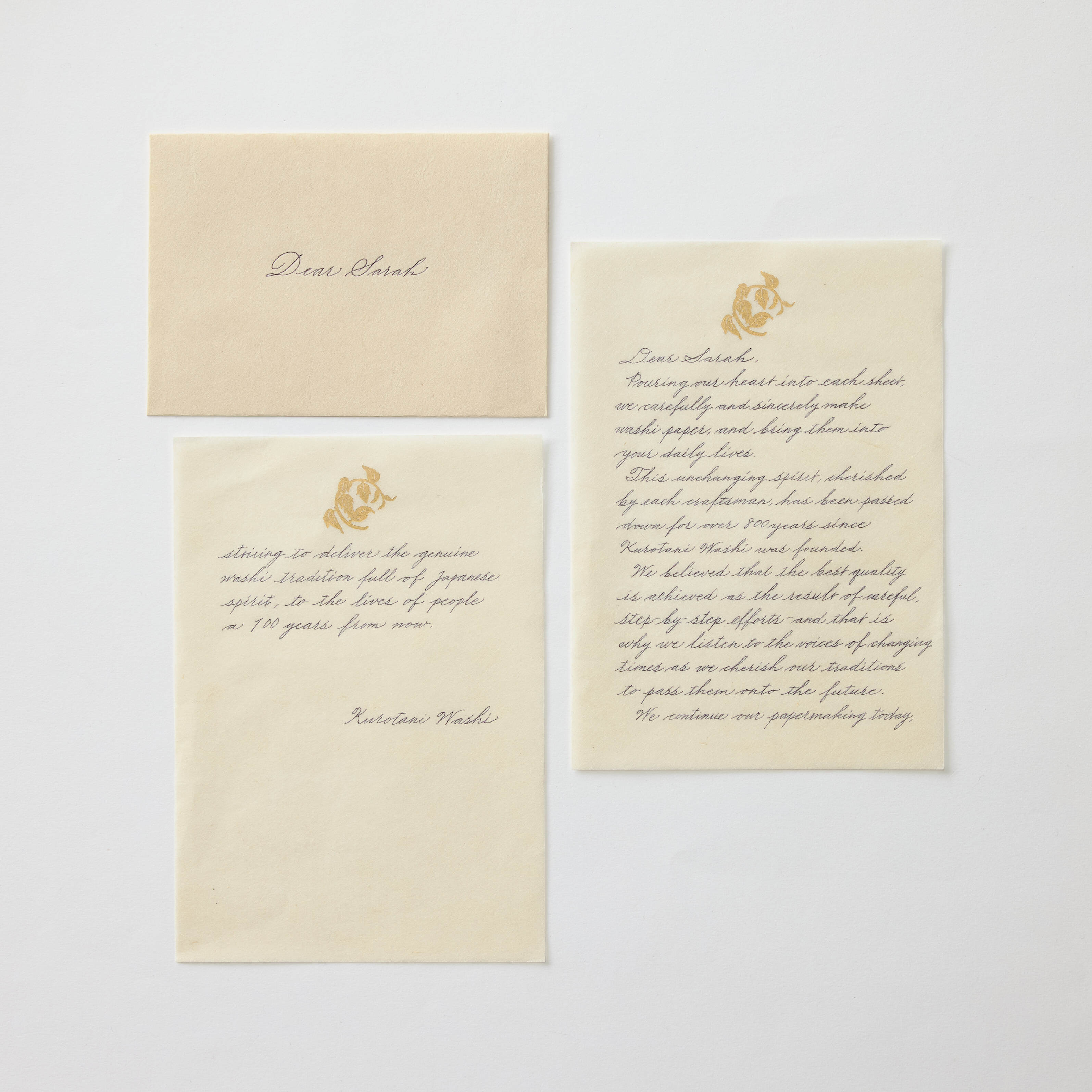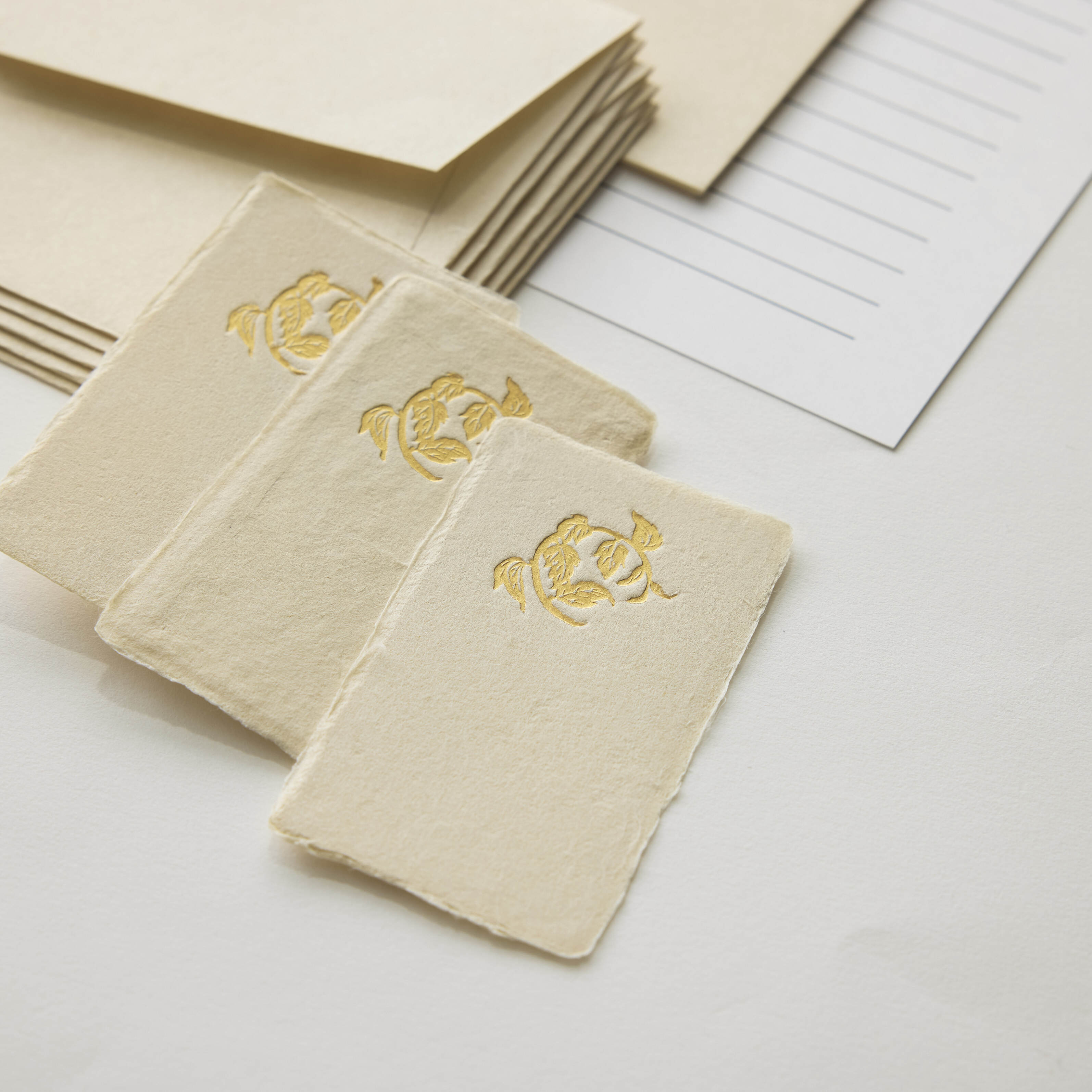 黒谷で手漉きされた和紙に、染色家・金山ちづ子さんが書籍の中で描かれた楮の「紙木印(かみきじるし)」を箔押ししたレターセットです。