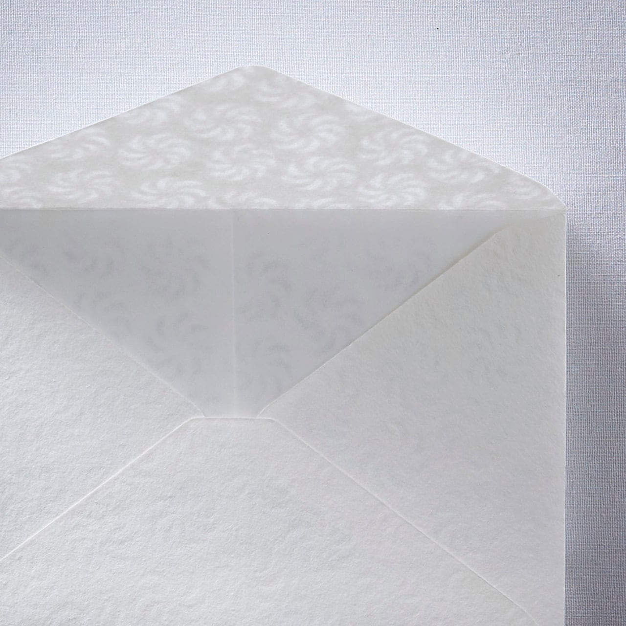 紙を光に透かすと絵柄が白く透けて見える、伝統的なすかしの技法を機械漉きに応用して作られた和紙で封筒を作りました。二つ折りのカードはにじみの少ない機械漉き和紙を使用しております。