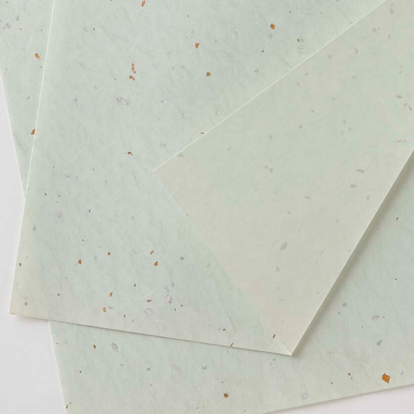 淡いライトグリーンに、水飛沫のような紋様を描く和紙の繊維と金銀砂子を散りばめた、控えめながら華やかさのある和紙です。小ロットの招待状やお品書きに最適です。