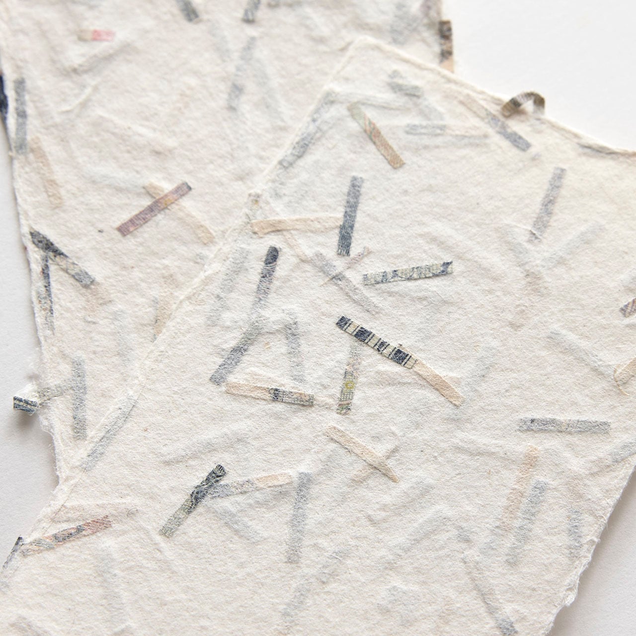 山梨県西嶋和紙・山十製紙さんによる紙幣チップ入り名刺紙です。使用済みとなった本物のお札チップが、ほどよく漉き込まれたユニークなテクスチャーが特徴です。